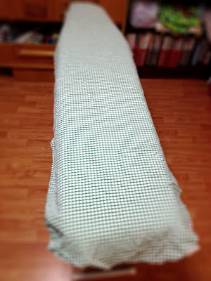 Step 7: Measured elastic at the centre length of the ironing board, 3 inches short each side. Then put it through the casing with edges held together with safety pin temporarily. Put the cover on the board and then pulled the elastic taut. Knotted the ends. (This was me planning for a future where I would need to change the elastic. And voila… I had my new ironing board cover with extra padding!!!