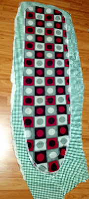 Step 2: Then I went ahead and quilted this sandwich with straight lines across top to bottom and left to write. Where I didn't have enough fabric to cover the batting, I added a patch (You will see it at the narrowest edge of the picture below.